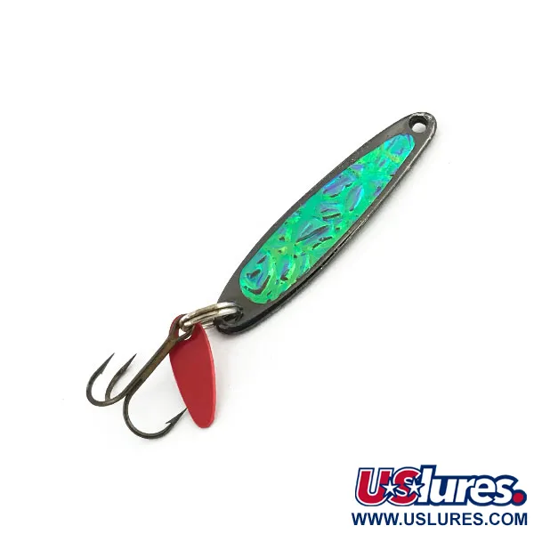 Näyttävä vihreä holografinen suomukuvio koristaa tämän klassisen pystypilkin pintaa ja heijastaa valoa tehokkaasti jopa syvissä ja hämärissä vesissä. Vain 1/16 unssin (2 g) painoinen Bay de Noc Swedish Pimple on tarkkuustyökalu, joka on suunniteltu ensisijaisesti ahvenen ja taimenen kalastukseen. Metallirungon taustapuolella ja reunoilla on tumma gunmetal-viimeistely, joka luo voimakkaan kontrastin kirkkaalle holografiselle teipille. Tämä tuotekoodilla 8935 tunnistettu yksilö on 5/5-kunnossa, ja siinä näkyvät Michiganissa toimivan valmistajan tuotannolle tyypilliset puhtaat linjat ja virheetön pinnoite. Punainen muovinen houkutuslevy on kiinnitetty uistinrenkaaseen pronssisen kolmihaarankoukun rinnalle, toimien visuaalisena iskupisteenä kaloille. Vieheen hoikka ja hieman kaareva profiili on suora jälkeläinen perinteisille skandinaavisille pystypilkeille, ja se on tarkoitettu pystyuittoon niin jäätasolta kuin avoveden syvänteissä. Kestävä varustus ja integroitu houkutussiipi ovat tämän vuosikymmeniä suosiossa pysyneen mallin vakiovarusteita.