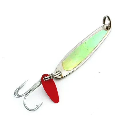 Kevyt 3/16 oz (5 g) paino määrittelee tämän pystypilkin, tehden siitä monipuolisen valinnan hienovaraiseen esittelyyn. Nikkelirunkoa korostaa hologrammiteippi, joka heijastaa vaaleanpunaista vihreällä sävyllä, vaihtamalla väriä valon osuessa metallipintaan. Kalojen huomion kiinnittämiseksi kolmihaarakoukun vieressä olevaan uistinrenkaaseen on kiinnitetty pieni punainen muovinen houkutuslevy. Pituudeltaan 1 1/2" (4 cm) oleva hoikka profiili on Michiganista, USA:sta kotoisin olevan Bay de Noc Lure Co. -yrityksen tavaramerkki. Tämä malli (tuotekoodi 9015) on erinomaisessa 5/5-kunnossa, pinnat ovat kirkkaat ja koukut terävät. Vaikka se yhdistetään usein pilkkimiseen, sen muotoilu sopii yhtä hyvin heittokalastukseen ahvenelle tai taimenelle.