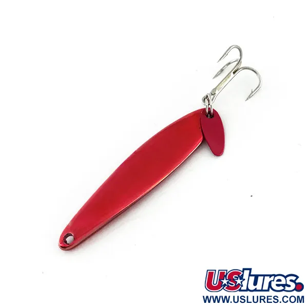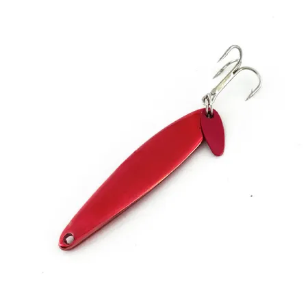 Tämä 5 cm pitkä viehe on varustettu sille ominaisella kapealla profiililla, joka on tehnyt Swedish Pimple -mallista vertikaalijigauksen ja pilkinnän suosikin sukupolvien ajan. Painoa vieheellä on 7 g, ja sen Red Metallic -viimeistely on suunniteltu tarjoamaan erinomaisen näkyvyyden heijastamalla valoa tehokkaasti vedessä. Tuote 9443 on peräisin Michiganin Gladstonesta, tunnetusta Bay de Noc -sarjasta. Tärkeä yksityiskohta tässä vieheessä on pieni punainen muovilätkä, joka on kiinnitetty uistinrenkaaseen kolmihaarakoukun viereen. Se toimii visuaalisena iskupisteenä pedoille pystyuistelussa tai nosto-lasku-uitossa. Viehe on upeassa 5/5 kunnossa, ja siinä on kirkas metallipinta sekä puhtaat alkuperäiskoukut, jotka ovat säilyttäneet tehdasloistonsa.