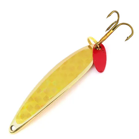 Kullattu metalli yhdistettynä keltaiseen prismaattiseen suomutarraan tekee tästä 14 gramman (1/2 unssin) lusikasta jokaisen viehepakin tähden. 5,5 cm (2 1/4") pitkä Bay de Noc Swedish Pimple on varustettu ikonisella solakalla profiililla, joka on ollut amerikkalaisen kalastuksen peruspilari yli puolen vuosisadan ajan. Läpikuultava punainen muovinen houkutuslevy on kiinnitetty uistinrenkaaseen kolmihaarakoukun lähelle, mikä tarjoaa erittäin näkyvän iskupisteen. Tässä nimenomaisessa yksilössä, tuotekoodiltaan 9567, ei ole käytön jälkiä, mikä oikeuttaa 5/5-kuntosuositukseen. Muotoilu on saanut voimakkaita vaikutteita skandinaavisista pystypilkeistä, ja michiganilainen valmistaja on optimoinut sen syvän veden esityksiin sekä pilkintään että avovetiseen kalastukseen. Jokainen komponentti kullatusta rungosta teräviin pronssiviimeisteltyihin koukkuihin on erinomaisessa kunnossa säilyttäen korkean välkeen, joka on välttämätön ahvenen, kuhan ja taimenen houkuttelemiseksi.