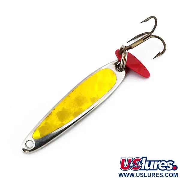 3/16oz (5g) paino antaa tälle mallille tarvittavan massan tarkkaan pystyuittoon syvissä vesikerroksissa. Nikkelöityä runkoa korostaa toisella puolella oleva teksturoitu kultainen upotus, kun taas taustapuoli on sileää, heijastavaa hopeaa. Pronssisen kolmihaarakoukun lähellä on ikoninen punainen muovinen houkutinlevy, joka on kiinnitetty tukevalla uistinrenkaalla – Bay de Noc -merkin tavaramerkki. USA:ssa valmistettu Swedish Pimple on säilyttänyt klassisen hoikan profiilinsa, joka on ollut ahvenen ja kuhan kalastajien suosikki mallin alkuajoista lähtien. Kunnoltaan uistin on luokiteltu 5/5, ja se on erittäin hyvin pidetty metallipinnan ja huomiovärien ollessa täysin ehjiä.