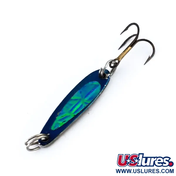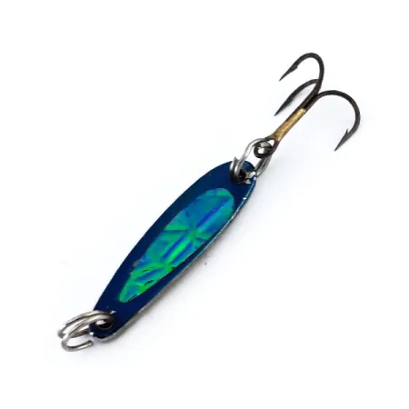 Vain 2 gramman (1/16 oz) painoisena tämä pienikokoinen pystypilkki on Bay de Noc -malliston pienin. Pituudeltaan 2,5 cm (1"), sen etupuolella on syvän sininen viimeistely ja eloisa holografinen prismateippi, joka taittaa vihreän ja sinivihreän sävyjä. Tämä valoa heijastava elementti on yhdistetty kiillotettuun hopeiseen taustaan, mikä luo voimakkaan visuaalisen kontrastin, joka on erityisen tehokas sameassa vedessä tai hämärissä olosuhteissa jään alla. Tuotekoodilla 9956 luetteloitu yksilö on säilyttänyt alkuperäiset uistinrenkaansa ja terävän kolmihaarakoukun. Osat ovat kirkkaat ja toimivat, ja yleiskunto on luokiteltu 5/5. Nämä amerikkalaisvalmisteiset vieheet ovat olleet suosittuja yli viisikymmentä vuotta vankan metallirakenteensa ansiosta, joka on suunniteltu putoamaan nopeasti ahvenen, taimenen tai kuhan oleskelusyvyyteen.