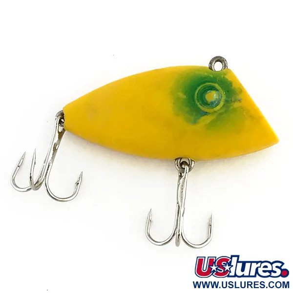 Tämä 7 gramman (1/4oz) painoinen lipless crankbait edustaa perinteistä yhdysvaltalaista Bayou Boogie -sarjan käsityötä. 5 cm (2") rungossa on kirkkaankeltainen pohjaväri, jota korostavat selkeä vihreä täplä silmän ympärillä ja hienovarainen oranssi sävy kuonon kärjessä. Tuotekoodilla 8831 tunnistettavassa mallissa on selkäpuolelle sijoitettu siimalenkki, mikä tekee siitä uppoavan. Whopper Stopper suunnitteli nämä ääntä pitäviksi vieheiksi, jotka soveltuvat eri vesikerrosten haravointiin esimerkiksi ahvenen tai basson kalastuksessa. Varustukseen kuuluu kaksi alkuperäistä ja kestävää kolmihaarakoukkua. Tämän vieheen kuntoluokitus on 4/5; pinnat ovat puhtaat ja maalipinta hyvin säilynyt, ja siinä on vain vähäisiä käytön jälkiä.