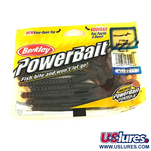 Tämän Berkley-yksilön "Motor Oil" -väri on klassinen läpikuultava ruskea, johon kalastajat ovat luottaneet vuosikymmeniä. Nämä 7" (18 cm) pituiset madot omaavat ikonisen uritetun rungon ja leveän sirppipyrstön, jossa on "PowerBait"-nimi. Tämä pakkaus (tuotekoodi 6957) sisältää yhdeksän käyttämätöntä USA:ssa valmistettua pehmo-viehettä ajalta, jolloin "Exclusive Powerbait Formula" mullisti sen, kuinka kauan kala pitää viehettä suussaan. Pakkaus on ehjä ja siinä korostetaan, että kala pitää vieheestä kiinni jopa 18 sekuntia. Jokaisessa madossa on tälle värille tyypillinen öljyinen hohde, joka on suunniteltu jigaustekniikoihin. Vieheet ovat käyttämättömiä ja säilytetty alkuperäisessä suljettavassa kelta-valkoisessa pussissa.