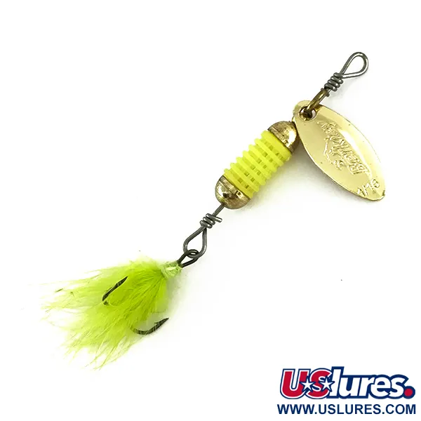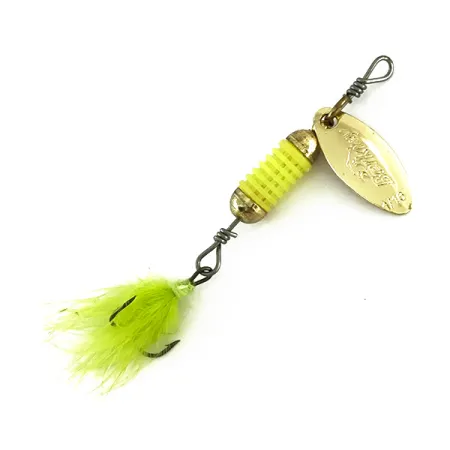 Kirkas chartreuse-värinen uritus määrittelee tämän perinteisen lippauistimen rungon, ja se on suunniteltu pitämään sisällään nestemäisiä houkutusaineita. Tämä 2,5 g (3/32 oz) painava viehe on varustettu kiillotetulla kullanvärisellä lehdykällä, johon on lyöty valmistajan nimi, tarjoten klassista metallista välkettä tasaisessa kelauksessa. Pituudeltaan 5,5 cm (2 1/4") viehe on viimeistelty sävyyn sopivalla chartreuse-värisellä höyhenkolmihaarakoukulla, joka antaa esitykselle pehmeän ja luonnollisen profiilin. Tässä mallissa (tuotekoodi 8185) on läpivientilanka ja ammattimaiset punokset sekä siimalenkissä että koukun silmässä. Kullanväristä lehteä tasapainottavat messinginväriset päätykappaleet, jotka sulkevat sisäänsä hajunkammion. Kaikki osat metallipinnoista hienoihin höyheniin ovat erinomaisessa kunnossa (arvosana 5/5).