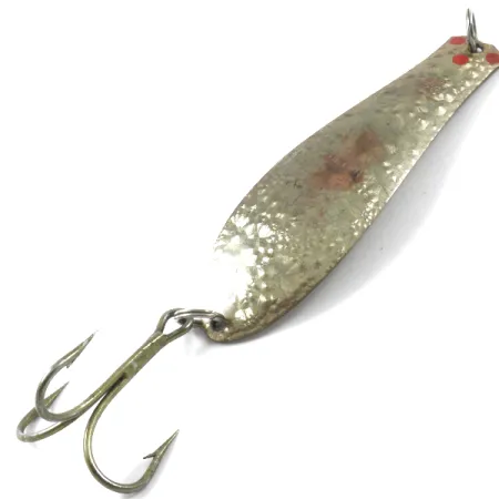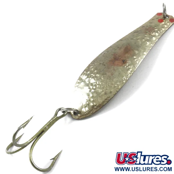 Tämä 1 unssin (30 g) painoinen lusikkauistin on varustettu harvinaisella 'Crystal'-viimeistelyllä, jonka vasaroitu kuvio on suunniteltu jäljittelemään rikotun lasin välkettä pinnan alla. Prescott Spinner Big Doctor 285, tuotekoodiltaan 3173, on pituudeltaan 4 1/4" (11 cm) ja siinä on perinteinen amerikkalainen profiili. Pienet punaiset korostuspisteet lähellä siimalenkkiä tuovat hienovaraisen värisävyn teksturoituun metallirunkoon. Tämä vintage-yksilö on 4/5-kunnossa, mikä kertoo hyvin säilyneestä historiasta ja iän tuomasta vähäisestä pintakulumasta. Alkuperäiset osat, mukaan lukien kolmihaarakoukku ja uistinrenkaat, ovat ehjät ja varmat heitto- tai uisteluun.