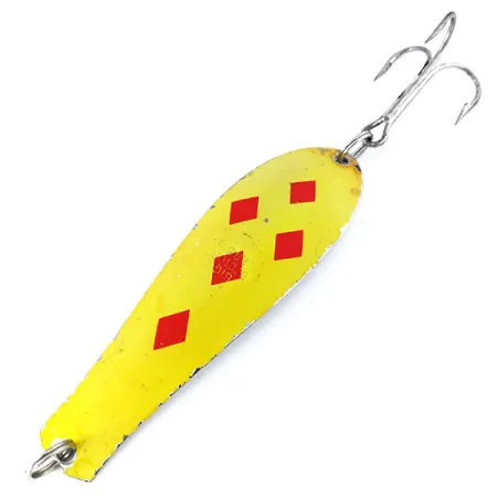 Viisi punaista timantti-kuviota erottuu jyrkästi tämän klassisen amerikkalaisen lusikkauistimen kirkkaankeltaisesta pohjaväristä. Painoltaan 28g (1oz) ja pituudeltaan 11cm (4 1/4") Prescott Spinner Big Doctor 285 UV on edelleen vakuuttava valinta kalastajille, jotka tavoittelevat suurempia petokaloja heittämällä tai uistelemalla. Tämän yksilön tuotekoodi on 10718 ja kuntoluokitus 4/5; siinä on pieniä ikääntymisen merkkejä, mutta se on säilyttänyt eloisan ja erittäin näkyvän pintaviimeistelynsä. Silmiinpistävin tekninen ominaisuus on keltaisen maalin fluoresoiva ominaisuus; ultraviolettivalossa uistimen runko hohtaa voimakkaan vihreänä, jolloin punaiset timanttileimat jäävät tummiksi, korkean kontrastin silueteiksi. Hienovarainen yksityiskohta löytyy keskimmäisestä timantista, johon "Big Doctor" -nimi on stanssattu suoraan metalliin. Uistin on varustettu vahvalla kolmihaaralla ja alkuperäisillä uistinrenkailla, valmiina näytille tai takaisin veteen.