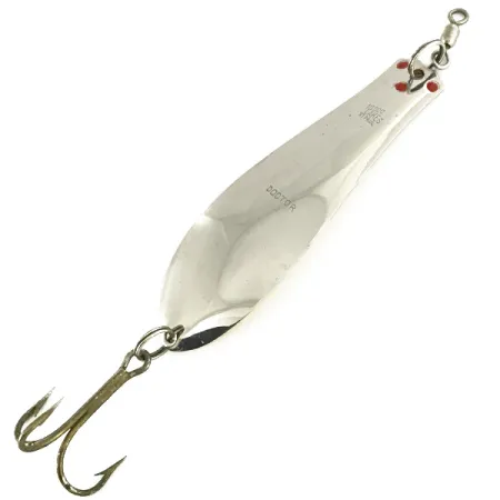 Huomattava 30g (1oz) paino tekee tästä lusikkauistimesta erinomaisen valinnan syvän veden petokalojen tavoittamiseen. Pituutta uistimella on 11cm (4 1/4"), ja sen kaksisävyinen ulkoasu koostuu kiillotetusta hopeisesta etupuolesta ja täyteläisestä kultaisesta kääntöpuolesta. Pienet punaiset tehosteet lähellä ylälenkkiä tuovat väripilkun kirkkaaseen metallirunkoon. Hopeiselle puolelle on leimattu selkeästi "DOCTOR"-tunniste, joka yksilöi tämän mallin tuotekoodilla 7110. Tämä Yhdysvalloissa valmistettu lusikka on varustettu järeällä kolmihaarakoukulla ja herkästi pyörivällä leikarilla, jotka on kiinnitetty vahvistetuilla uistinrenkailla. Uistin on 5/5-kunnossa, ja sekä kulta- että hopeapinnat ovat säilyttäneet alkuperäisen korkeakiiltoisen viimeistelynsä. Paksu metallirakenne on suunniteltu raskaaseen heittokalastukseen tai uisteluun suurten makean veden petokalojen pyyntiin.