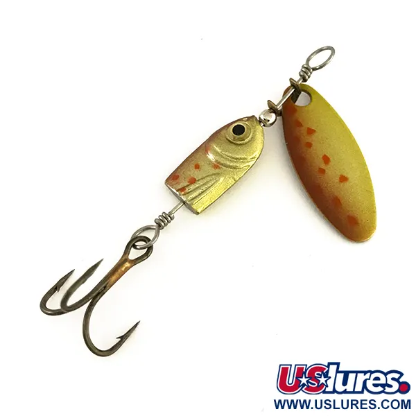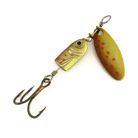Hopeanvärisen lehden kääntöpuolelle lyöty "Finland"-alkuperämerkintä tekee tästä lipasta eurooppalaisen uistimenvalmistuksen klassikon. Tässä 5 cm pituisessa ja tuotekoodilla 7889 yksilöidyssä mallissa on 4 gramman painoinen, kalanpäätä muistuttava runko. Taimen-värikuvio on levitetty huolellisesti lyijyrunkoon ja ovaalin lehden etupuolelle. Kuvio koostuu lämpimän kultaisesta pohjasta, kirkkaista oransseista täplistä ja selkeästä tummasta silmästä. Terävä kolmihaarainen koukku on kiinnitetty runkolankaan, jossa on tiukat lankapunokset ja pienet metalliset välihelmet. Kunto on luokiteltu 5/5, mikä tarkoittaa erittäin hyvin säilynyttä maalipintaa ja kirkkaita, heijastavia metalliosia.