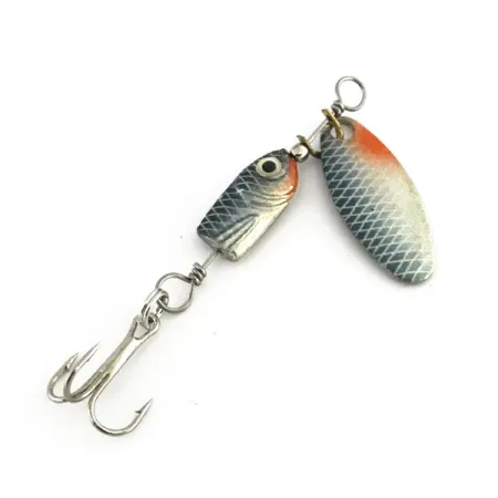 Vaaleansiniset suomukuviot koristavat sekä tämän 4 gramman (1/8 oz) lipan lehteä että runkoa, korostaen sen klassista suomalaista muotoilua. Blue Fox Flash Deep Runner, tuotekoodilla 8967, on varustettu 5 cm (2") sivuprofiililla ja painotetulla rungolla, joka jäljittelee pientä syöttikalaa. Rungossa on realistinen maalattu silmä ja oranssinsävyinen pääpuoli, joka soveltuu yhteen pajunlehtimallisen lipan yläosan tehosteen kanssa. Lipan etupuolella on monimutkainen sinisävyinen ja hopeinen suomukuvio, kun taas kääntöpuoli on viimeistelty pelkistetyllä kiillotetulla hopealla. Messinkinen sankalevy sallii lehden pyöriä vapaasti hopeisen lankalangan ympärillä, johon on kiinnitetty kolmihaarakoukku uistinrenkaalla. Kunto on arvioitu 5/5, sillä viehe on poikkeuksellisen siisti, värit ovat kirkkaat ja metalliosat kiiltävät. Metallipintojen hienovarainen ristikkäiskuviointi lisää vieheen visuaalista syvyyttä.
