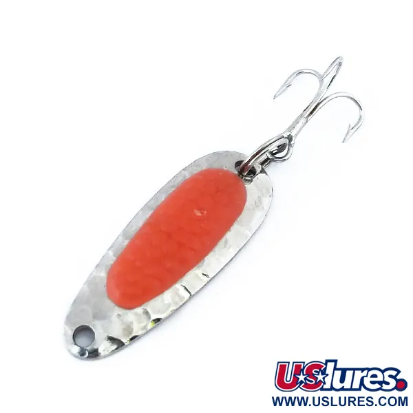 Vasaroitu nikkeli luo voimakkaan välkkeen tähän kompaktiin 3,5 cm (1 1/2") paksusta messingistä valmistettuun lusikkaan. Blue Fox Pixee UV painaa 4,5 g (3/16 oz) ja siinä on klassinen pisaraprofiili, joka pitää uintinsa voimakkaassa virrassa tai syvissä järvimontuissa. Tämän mallin (tuotekoodi 11006) tunnusomaisin piirre on keskellä oleva punainen insertti, joka jäljittelee lohen mätimunaa. Tämä fluoresoiva elementti reagoi UV-valoon tarjoten hohtavan iskupisteen heikossa näkyvyydessä. Blue Fox on suunnitellut tämän vieheen tarpeeksi painavaksi pitkiin heittoihin jopa rannikkotuulessa. Yksilö on erinomaisessa kunnossa (luokitus 5/5). Takarenkaaseen on kiinnitetty terävä kolmihaarakoukku taimenen, lohen tai ahvenen pyyntiin.