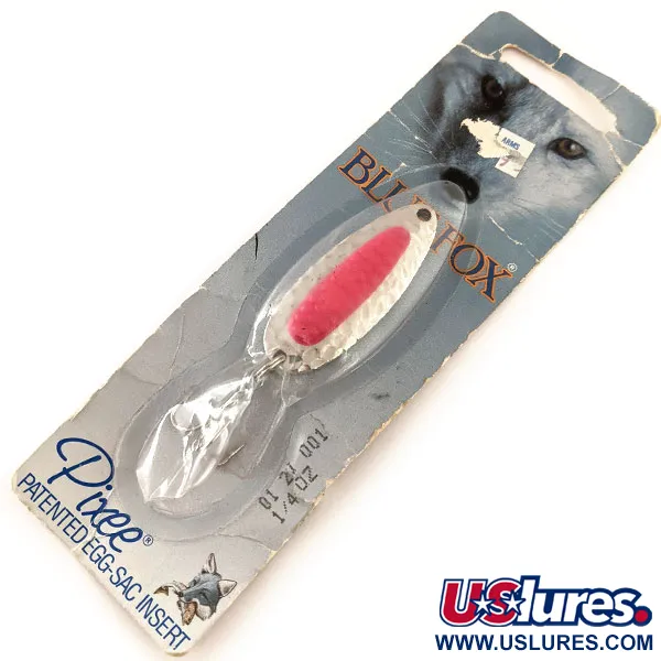 Vasaranlyömäpinnalla varustetun nikkelilevyn keskiössä on kirkkaan vaaleanpunainen, fluoresoiva mätipussi-insertti, joka toimii tämän mallin tunnusomaisena visuaalisena elementtinä. Tuotekoodilla 11858 listattu uistin on 4,5 cm (1 3/4") pitkä ja painaa 7 g (1/4 oz), mikä mahdollistaa pitkät heitot jopa rannikon vastatuulessa. Raskas messinkirakenne on suunniteltu kestämään suolaisen veden ja voimakkaiden jokivirtausten aiheuttamaa korroosiota. Tämä Blue Fox Pixee on käyttämätön, ja se on säilynyt alkuperäisessä vuoden 1984 pakkauksessaan Minnesotan Cambridgen kaudelta. UV-reaktiiviset ominaisuudet ja vasaroitu pinta on suunniteltu parantamaan näkyvyyttä ja välkettä sekä heitto- että uistelukalastuksessa. Kalastajat käyttävät tätä mallia yleensä lajeille kuten steelhead, lohi ja hauki, hyödyntäen sen kykyä uida sekä syvällä että matalalla. Pakkauksen kääntöpuolella on tekniset ohjeet erikoistekniikoihin, kuten lake pumping ja river tumbling. Yksilön kuntoluokitus on 6, sillä koukut ja runko ovat tehtaanjäljiltä eivätkä ole koskaan nähneet vettä.