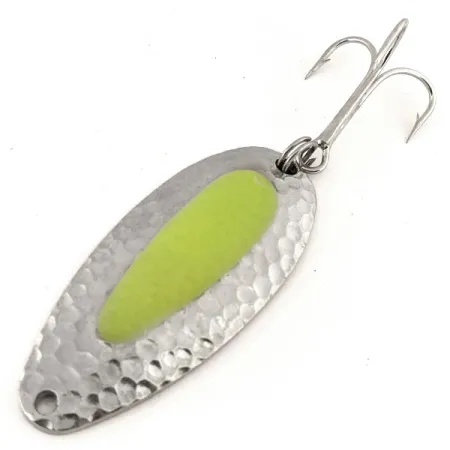 Tämä 6,5 cm (2 1/2 tuumaa) pitkä, paksuseinäisestä messingistä valmistettu lusikkauistin on suunniteltu läpäisemään rannikkotuulet ja saavuttamaan syvät montut, joissa lohet ja kirjolohet usein oleskelevat. Vasaroitu nikkelipinta tarjoaa tekstuurin, joka heijastaa valoa tehokkaasti, ja keskellä oleva kirkkaankeltainen keino-mätimuna on UV-käsitelty näkyvyyden parantamiseksi sameassa vedessä tai hämärässä. Tuotekoodilla 12701 varustettu 24 g (3/4 oz) uistin on uudenveroisessa kunnossa (luokitus 5/5). Tämä malli oli alun perin osa National Expert Bait (NEBCO) -valikoimaa ennen merkin siirtymistä Blue Foxille, ja siinä on korkealaatuinen kolmihaarainen koukku kiinnitettynä vankalla uistinrenkaalla. Se on erinomainen valinta niin kovaan jokivirtaan kuin uisteluun järvenselillä, missä sen paino mahdollistaa syvän uintisyvyyden. Etureunassa on siisti kiinnityspiste, joka on tarkoitettu käytettäväksi lukkoleikarin kanssa luonnollisen rullaavan uintiliikkeen aikaansaamiseksi.