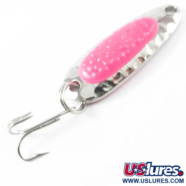 Tämän 1 1/2" (3,5 cm) Blue Fox Pixee -lusikkauistimen vasaroitu nikkelipinta heijastaa valoa koko rungon pituudelta, luoden syöttikalaa muistuttavan välkeen. Painoltaan 3/16 oz (4,5 g) oleva paksu messinkirunko on suunniteltu pitkiin heittoihin voimakkaissa virroissa tai rannikkotuulessa. Tuotekoodilla 3317 tunnistettava malli erottuu fluoresoivalla "lohimäti"-lisäosallaan, joka hohtaa UV-valossa houkutellen teräspääkirjoja ja lohia syvistä padoista. Uistin on 5/5 kunnossa, ja siinä on kirkas heijastava pinta sekä terävä kolmihaarakoukku. Alun perin National Expert Bait Companyn (Nebco) valikoimaan kuulunut malli siirtyi myöhemmin Blue Fox -brändin alle, ja se tunnetaan erityisesti suurten lohikalojen pyynnissä. Kääntöpuolelle on stanssattu paino ja brändin nimi sekä pieni keräilijän merkintä mallinumerosta.