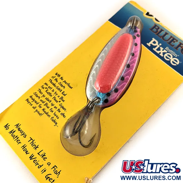 Tämä 14 g (1/2 oz) painoinen paksusta messingistä valmistettu lusikkauistin on suunniteltu erityisesti pitkiin heittoihin rannikkotuulessa tai voimakkaassa jokivirtauksessa. Blue Fox Rattlin Pixee, tuotekoodi 12334, sisältää ikonisen läpikuultavan punaisen mätipussi-insertin, joka toimii ainutlaatuisena iskupisteenä lohille ja teräskirjolohille. Tämä yksilö on käyttämätön ja siinä on eloisa kirjolohiväritys hienorakenteisella holografisella pinnalla, pituuden ollessa 5,5 cm (2 1/4"). Vieheen messinkiselle kääntöpuolelle on stanssattu mallinumero 01-30R, mikä vahvistaa sen painoluokan. Varustuksena on terävä Rapala VMC -kolmihaarakoukku mustalla nikkelöinnillä, joka on valittu kestävyytensä ja korroosionkestävyytensä vuoksi sekä makeaan että suolaiseen veteen. Alun perin Alaskan vaativissa olosuhteissa maineensa luonut Pixee hyödyntää suurta ominaispainoaan tavoittaakseen syvät montut, joissa suuret kalat usein oleskelevat.