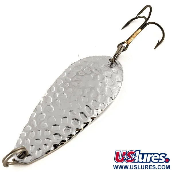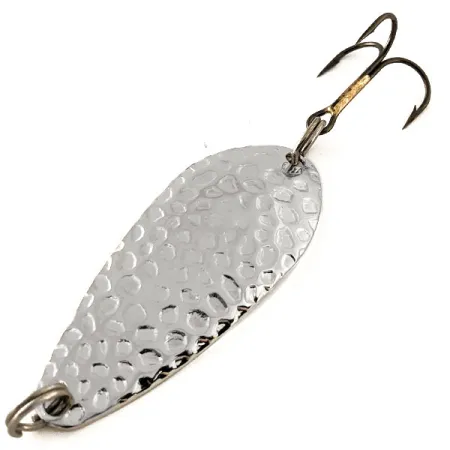 Vasaroitu nikkelipinta määrittelee tämän Blue Fox Strobe -lusikkauistimen ilmeen, tarjoten klassisen estetiikan, joka on monen kalastajan luottovaruste. Tuotekoodilla 11867 tunnistettava uistin painaa 2/5 oz (11g) ja on pituudeltaan 2 1/4" (5,5 cm). Tämä yksilö on kuntoluokitukseltaan 6, ja sen metallipinnat sekä koukut vaikuttavat tehtaanjälkeisiltä. Kääntöpuolelle on stanssattu Blue Fox -leima ja paino, mikä kertoo sen alkuperästä USA:ssa. Pyrstöön on kiinnitetty vakiomallinen kolmihaarakoukku uistinrenkaalla, joten viehe on täysin kalastusvalmis heittoon tai uisteluun.