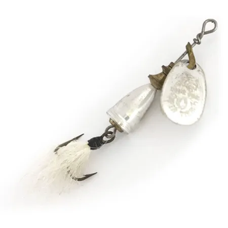 Lipan ja kupurungon hopeointi antaa tälle yksilölle klassisen, valoa heijastavan profiilin, joka miellyttää vanhojen kalastusvälineiden harrastajaa. Tämä 5 cm pitkä ja 3,54 g painava Blue Fox Super Vibrax 0 Foxtail (Tuotekoodi 9146) on varustettu tunnusomaisella kaksiosaisella kupurakenteella. Lipassa on ”MADE IN FRANCE” -leima, jota keräilijät arvostavat, sillä se osoittaa Vibrax-sarjan varhaiseen tuotantokauteen ennen valmistuksen siirtymistä muualle. Käsin sidottu valkoinen karva- ja höyhenperho peittää kolmihaarakoukun, lisäten erottuvan visuaalisen hahmon ja pehmeämmän tekstuurin pyrstöosaan. Hopeapinta on säilynyt kirkkaana ja messinginsävyiset sisäosat ovat hyväkuntoisia, mikä antaa vieheelle 5/5 kuntoluokituksen. Kupumainen runko on suunniteltu lähettämään matalataajuista ääntä, kun sisäosa pyörii ulkokuorta vasten tasaisessa kelauksessa. Tukeva lankarakenne yhdistää sangan varassa pyörivän lipan perhokoukkuun, säilyttäen rakenteellisen kestävyyden taimenen ja ahvenen kevyeen kalastukseen.