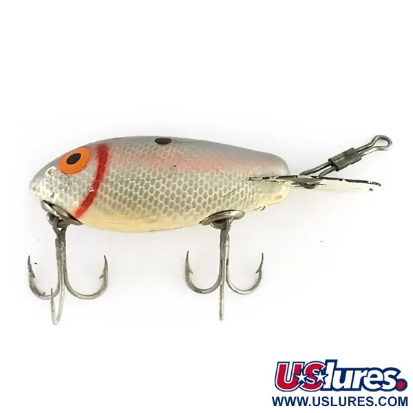 Hopean ja valkoisen sävyt peittävät tämän klassisen vieheen puurungon, joka edustaa valmistusajanjaksoa vuosien 1949 ja 1970 välillä. Painoltaan 10 g (1/3 oz) Bomber 200 series on suunniteltu jopa 2 metrin (6,5 ft) uintisyvyyteen aktiivisten petokalojen, kuten hauen, toutaimen ja ahvenen, tavoittamiseksi. Viimeistelyssä on monimutkainen verkkosuomukuvio, jota korostavat erottuva punainen kidusviiva, yksittäinen musta hartiatäplä ja suuret oranssit silmät mustilla pupilleilla. Kuntoluokitus 3/5 kertoo mallin aidosta historiasta; käytön jälkiä ja pientä maalikulumaa on nähtävissä pääasiassa turpa- ja pyrstöosissa. Tämän USA:ssa valmistetun yksilön alapuolelle on kiinnitetty kaksi kolmihaarakoukkua, ja se on tunnistettavissa tuotekoodilla 8502. Takaosaan asennettu metallinen uintilevy on tukevasti kiinni, toimien tämän kelluvan vintagemallin teknisenä tunnusmerkkinä.