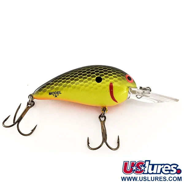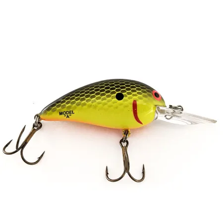 Tummalla kennokuvioinnilla varustetut suomut vaihtuvat kirkkaaseen chartreuse-kylkeen tässä 5,5 cm (2 1/4") vaapussa. Klassisella Model "A" -leimalla ja tuotekoodilla 11853 tunnistettavassa Bomber B04A UV -mallissa on erikoisviimeistely, joka hehkuu ultraviolettivalossa. Painoltaan 8 g (1/4 oz) runkoa korostavat selkeä punainen viiru pään lähellä ja eloisa punainen silmä. Kirkas uintilevy on suunniteltu saavuttamaan 0,9–2,1 metrin (3-7 ft) syvyys, mikä tekee siitä monipuolisen valinnan sekä heitto- että uistelukalastukseen. Tämä uistin on erinomaisessa kunnossa (arvosana 5/5), ja siinä on alkuperäiset pronssinväriset kolmihaarakoukut tukevasti kiinni. Sen loistavat ominaisuudet ovat erityisen hyödyllisiä tavoiteltaessa haukea tai kuhaa sameassa vedessä tai hämärässä.