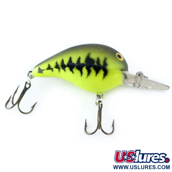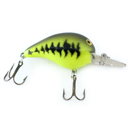 Tämän 5 cm (2") vieheen Baby Bass -viimeistely tarjoaa iskevän ja korkeakontrastisen profiilin, joka erottuu edukseen erilaisissa vesiolosuhteissa. Tämä tuotekoodilla 11084 tunnistettava Bomber Fat A B05F on klassinen Yhdysvalloissa valmistettu kelluva vaappu, joka painaa 10 g (1/3 oz). Vieheessä on kestävä, integroitu kirkas uintilevy, joka on suunniteltu viemään se 1,8–2,4 metrin (6–8 ft) syvyyteen, mikä tekee siitä luotettavan valinnan ahvenen ja turvan heittokalastukseen. Tämä yksilö on kunnoltaan erinomainen (5/5), ja sen alkuperäinen maalipinta sekä koukut ovat säilyneet loistavassa kunnossa. Värikuvio vaihtuu tumman oliivinvihreästä selästä kirkkaan chartreuse-kylkiin, joita koristaa sarjalle ominainen tumma kylkitäpläkuvio. Kaksi terävää kolmihaarakoukkua on kiinnitetty vatsaan ja pyrstöön tavallisilla uistinrenkailla. Suuret keltaiset silmät ovat tämän sarjan tunnusmerkki, ja ne tarjoavat selkeän iskupisteen vieheen etuosaan.