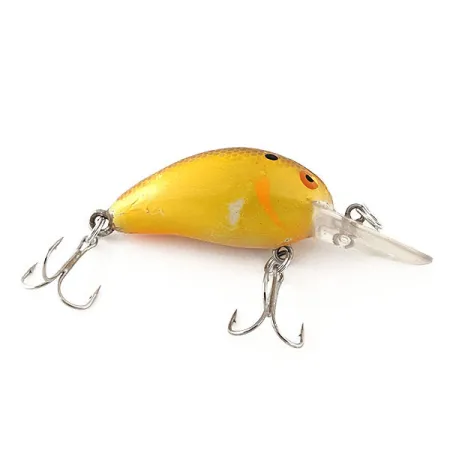 Tämä 7 g painava kompakti Bomber model B 4A on perinteinen amerikkalainen vaappu, joka on säilyttänyt paikkansa kuhankalastajien ja hauenkalastajien suosiossa. Uintisyvyys on 0,9–2,1 metriä, ja kelluva rakenne sopii erinomaisesti sekä heittokalastukseen että uisteluun keskisyvien rakenteiden päällä. Viimeistely on huomiota herättävä keltainen, jota täydentävät oranssi vivahde kyljessä ja tumma suomukuvio 4,5 cm rungon selkäpuolella. Kirkas muovinen uintilevy toimii pohjana varusteille, joihin kuuluu kaksi alkuperäistä kolmihaarakoukkua. Tuotekoodilla 12074 tunnistettu yksilö on 4/5 kunnossa; siinä on vain vähäisiä käytön jälkiä, jotka kertovat sen historiasta kirkkaan värityksen säilyessä. Suurikontrastiset oranssireunaiset silmät ja mustat pistekuvioinnit päälaella antavat sille Bomber-sarjalle ominaisen ulkonäön.