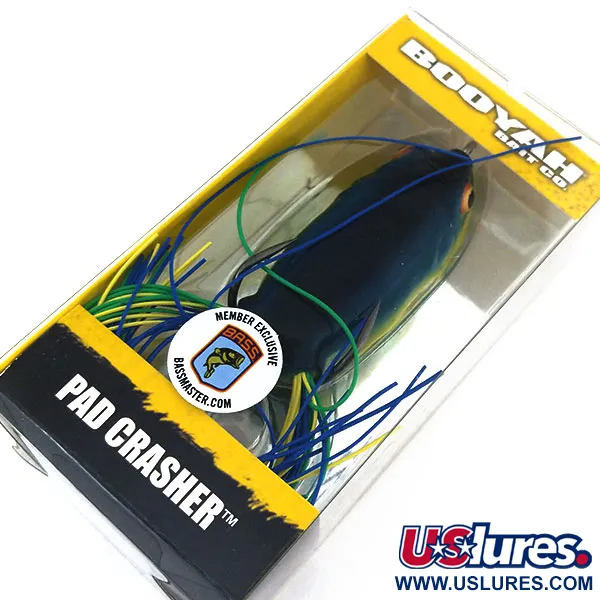Tässä 14 g (1/2 oz) onttorunkoisessa sammakkovieheessä tummansininen selkä vaihtuu kirkkaankeltaiseen vatsaan. Tuotekoodilla 10841 tunnistettu Booyah Pad Crasher on suunniteltu kalastukseen tiheän kasvuston ja lumpeiden seassa. Monivärinen silikonihapsu koostuu sinisistä, vihreistä ja keltaisista säikeistä, jotka on suunniteltu jäljittelemään uivan sammakkoeläimen jalkoja. Tämä yksilö on käyttämätön alkuperäisessä keltamustassa Booyah Bait Co. -pakkauksessa, jonka ikkunassa on "Member Exclusive B.A.S.S." -tarra. Terävät, ylöspäin suunnatut kaksoiskoukut istuvat tiiviisti pehmeää runkoa vasten estäen tarttumisen kasvustoon, mutta ne paljastuvat heti kalan iskiessä. 6 cm (2 1/4") pituus tarjoaa kompaktin profiilin, joka vastaa yleisimpiä saaliskaloja. Pienet oranssit silmät tuovat hienovaraisen kontrastin vieheen tummaan päähän. Sisäinen painotus on sijoitettu auttamaan viehettä laskeutumaan oikein veden pinnalle pitäen koukun kärjet ylöspäin.