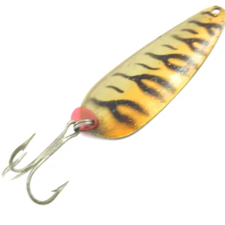 Painoltaan 19-grammainen (2/3 oz) Boss Lures -merkin Boss Spoon on varustettu Golden Tiger -viimeistelyllä, joka fluoresoi UV-valossa parantaen näkyvyyttä sameassa vedessä. Tämä Yhdysvalloissa valmistettu malli, tuotekoodilla 4070, on pituudeltaan 7 cm (2 3/4") ja sen pisaranmuotoinen profiili on optimoitu heittokalastukseen ja uisteluun. Tukeva kolmihaarakoukku on kiinnitetty uistinrenkaalla vaaleanpunaisen iskupisteen viereen, mikä tuo pienen kontrastin kulta-mustaan tiikeriraidoitukseen. Metallirungon kääntöpuoli on maalaamatonta messinkiä, joka välähtää voimakkaasti liikkuessaan vesipatsaassa. Kuntoluokitukseltaan 4/5 oleva viehe on hyvin pidetty, ja siinä on vain vähäisiä ikään kuuluvia jälkiä pinnassa. Tämä väritys on suunniteltu erityisesti hämäriin olosuhteisiin tai syvempään veteen, missä UV-reaktiivinen maali tarjoaa näkyvyysetua.