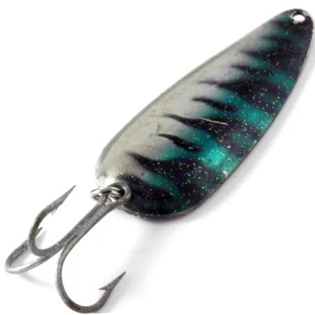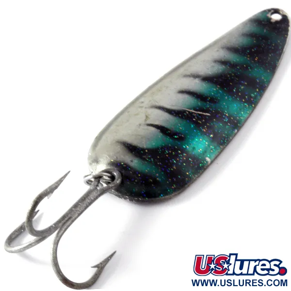 Green Tiger -kuviointi tummilla pystyraidoilla hohtavan nikkelipohjan päällä määrittää tämän amerikkalaisvalmisteisen lusikkauistimen ulkonäön. Painoltaan 19 g (2/3 oz) ja pituudeltaan 7 cm (2 3/4") oleva Boss Lures Boss Spoon kantaa tuotekoodia 4086, ja sen sinivihreään ja mustaan maaliin on sekoitettu hienoa moniväristä hilettä. Taustapuoli on kiillotettua nikkeliä korkean välkkeen ja kontrastin luomiseksi. Keräilijälle tämä yksilö on kunnoltaan 4/5, sisältäen pieniä pintajälkiä ja iänmukaista vähäistä käytön jälkeä. Vankka kolmihaarakoukku on kiinnitetty uistinrenkaalla perään, ja ylälenkki on valmis lukolle tai perukkeelle.