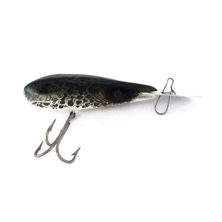 Painavampi miltä näyttää 7 g (1/4 oz) painollaan, tämän yksilön kiinteä kumirakenne on Burke Flexo-Products Companyn tunnusmerkki 1900-luvun puolivälistä. Tuotekoodilla 10129 varustetussa uistimessa on korkeakontrastinen mustavalkoinen laikukas kuvio, joka on suunniteltu erottumaan vedessä. Tukeva metallinen uintilevy on kiinnitetty etuosaan vetämään kelluva kumirunko syvyyksiin tasaisessa kelauksessa. Rungon pituus on 6 cm (2 1/4"), ja sen sivuilla on edelleen selvästi näkyvissä alkuperäiset "Big Dig"- ja "Burke"-leimat. Koukuissa ja osissa on kevyitä käytön jälkiä, mikä antaa kuntoarvioksi 3/5. Yksi kolmihaarakoukku on kiinnitetty tukevasti vatsan alle, mikä tekee tästä täydellisen palan Michiganin kalastushistoriaa.