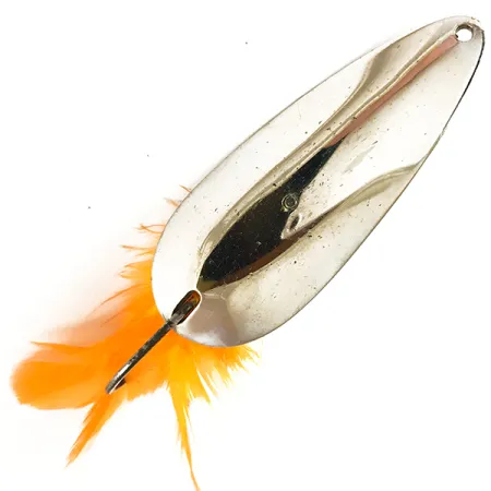 'ACCETTA'- ja 'Weed-Dodger'-nimillä leimattu nikkeliviimeistelty lusikkauistin on klassinen esimerkki vuosisadan puolivälin ruohikkoisesta muotoilusta. 2/3 unssin (19 g) paino tekee siitä jämäkän sen 2 1/2 tuuman (6,5 cm) runkoon nähden. Sen kiillotettu nikkelipinta heijastaa valoa tehokkaasti, ja kirkkaat oranssit höyhenet on sidottu yksittäiskoukkuun visuaaliseksi kiinnityskohdaksi. Weed-Dodgerissa on erikoistunut lankasuojus, joka on suunniteltu ohjaamaan lumpeenlehdet ja tiheä kasvillisuus pois koukun kärjestä, mikä helpottaa heittämistä paksun kasvuston sekaan. Arvosanalla 5/5 uistimessa on vaikuttavan puhdas viimeistely ja selkeät merkinnät. Tuotekoodilla 3607 tietokannasta löytyvä uistin edustaa sitä käytännön kekseliäisyyttä, jota Tony Accetta toi kalastusvälineteollisuuteen. Tukeva yksittäiskoukku on integroitu suoraan runkoon ja kiinnitetty ruuvattavalla levyllä, joka ankkuroi myös metallisen ruohosuojan.