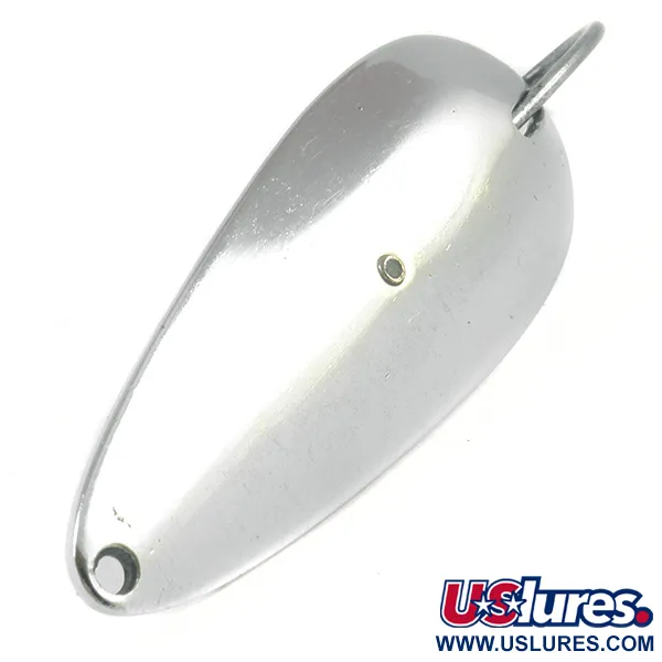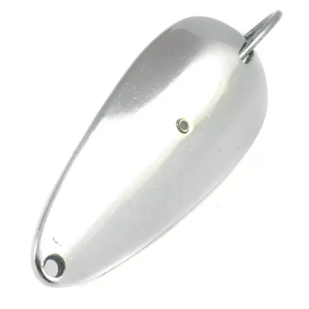 Tämä korkeakiiltoiseksi nikkelöity 5,5 cm (2 1/4") lusikkauistin edustaa keskivuosisadan amerikkalaista ruohosuojattua viehesuunnittelua. Tony Accetta Weed Doger painaa 10 g (1/3 oz), ja sen tuotekoodi on 3211. Vieheessä on kestävä yksittäiskoukku, joka on integroitu suoraan koveraan runkoon. Koukku on kiinnitetty erottuvalla ruuvilla, joka ankkuroi myös lankamaisen ruohosuojan. Ominaisuus on suunniteltu heittämiseen lumpeikkoihin ja tiheään kasvustoon. Sisäpuolelle on selkeästi meistetty merkinnät 'TONY ACCETTA' ja 'WEED DOGER', mikä vahvistaa sen alkuperän Yhdysvalloista. Tämä yksilö on 5/5-kunnossa, ja sen pisaranmuotoisessa rungossa on peilimäinen pinta. Kapeassa päässä on tarkkuusporattu reikä siiman kiinnittämistä varten, kun taas leveä peräpää toimii kiinteän koukkukokoonpanon pohjana.