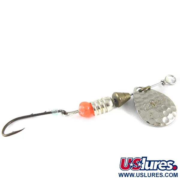 Pisaranmuotoiseen lehteen on selkeästi meistetty Cabela’s-nimi ja kokomerkintä "1", mikä tekee tästä klassisen amerikkalaisvalmisteisen vieheen. Kokonaispituudeltaan 7 cm (2 3/4") mittainen lippa on rakennettu tukevaan lankaviiksi-runkoon, joka päättyy yksihaarakoukkuun. Runko koostuu painojen ja houkuttimien yhdistelmästä, johon kuuluu messinginsävyinen kartio, uritettu hopeanvärinen helmi ja kirkkaan oranssi helmi erottuvan visuaalisen profiilin luomiseksi. 4 gramman (1/8 oz) painoisena se on ketterä vaihtoehto hienovaraiseen kalastukseen pienemmissä vesistöissä. Tämä nimenomainen 1541-malli on säilynyt hyvin, siinä on vain vähäisiä ikääntymisen merkkejä, ja sen kuntoluokitus on 4/5. Lehden vasaroitu nikkelipinta tarjoaa tekstuuria, joka heijastaa valoa useista eri kulmista kelauksen aikana. Etuosan yksinkertainen lankasilmukka mahdollistaa suoran solmun tai kiinnityksen pieneen lukkoon.