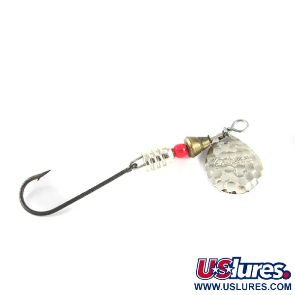 Pisaranmuotoisen lipan vasaroitu pinta kerää valoa eri kulmista heijastaen kirkasta nikkelin hohdetta. Tuotekoodilla 1542 luetteloitu Cabela's-merkkinen klassinen lippa on 7 cm pitkä ja vankka esimerkki toimivasta viehesuunnittelusta. Sen paino on 4 g, mikä tekee siitä sopivan valinnan taimenen tai ahvenkalojen kevyeen kalastukseen. Kokonaisuuteen kuuluu kirkkaanpunainen helmi, joka sijaitsee messinginvärisen kartiomaisen holkin ja hopeanvärisen uritetun rungon välissä tuomassa visuaalista kontrastia. Pitkävartiseen yksihaarakoukkuun asennettu malli on tarkoitettu kalastajille, jotka suosivat yksinkertaisempaa vaihtoehtoa kolmihaarakoukuille. Nikkeliviimeistely on erittäin hyvin säilynyt, ja Cabela's-leima erottuu selvästi lipan pinnasta. Kuntoarvio on 5/5.