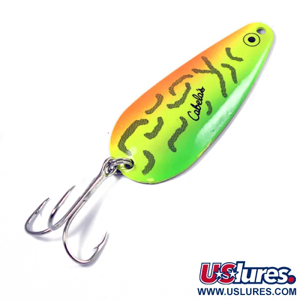 Eloisat Fire Tiger -kuviot koristavat tämän 7 cm (2 3/4") metallisen lusikan kuperaa puolta, vaihdellen rohkeasta oranssista hartiaosasta kirkkaankeltaiseen vatsaan ja limenvihreään pyrstöön. Tuotekoodilla 2190 varustettu Cabela's-merkkinen viehe on osoitus perinteisestä yhdysvaltalaisesta valmistuksesta. Etupinta on yksityiskohtaisesti viimeistelty mustilla kiemuraisilla raidoilla ja selkeällä mustalla silmätarralla, kun taas kääntöpuoli paljastaa korkeakiiltoisen nikkelipinnan maksimaalista välkettä varten. Varustukseen kuuluu vankka uistinrengas takana, joka kiinnittää kiiltävän kolmihaarakoukun. Viehe on täysin uudenveroisessa kunnossa ja näyttää täysin käyttämättömältä, ansaiten kuntoluokituksen 5/5. Painoltaan 19 g (2/3 oz) oleva lusikkauistin sopii erinomaisesti raskaaseen heittokalastukseen tai vertikaalijigaukseen.
