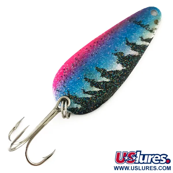 12 gramman paino antaa tälle lusikkauistimelle tiheyden, jota tarvitaan pitkiin heittoihin syvään veteen tai jokivirtausten poikki. Taimen-väritys on visuaalisesti näyttävä, ja siinä on eloisa neonvaaleanpunainen ja sininen liukuväri, jota on korostettu runsaalla monivärisellä hileellä. 5,5 cm:n rungon reunaa pitkin mustat ikivihreiden puiden siluetit tarjoavat voimakkaan kontrastin kimaltelevaa taustaa vasten. Vieheen päässä Cabela's-tuotemerkki on painettu selkeällä mustalla tekstillä. Lusikan kääntöpuoli on viimeistelty loistavalla kiillotetulla hopealla, jonka tarkoituksena on luoda kirkas välähdys, joka erottuu maalatusta etupuolesta. Tämä Yhdysvalloissa valmistettu malli, tuotekoodiltaan 8517, on varustettu kestävällä uistinrenkaalla ja terävällä kolmihaarakoukulla. Arvosanalla 5/5, viehe on erinomaisessa kunnossa ja sen pinta on säilynyt kirkkaana ja ehjänä.