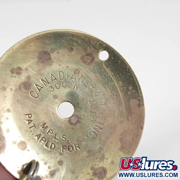 Lämmin kultapinta peittää tämän vintage-yksilön 18 g (2/3 oz) pyöreän rungon. Canadian Bait valmistama Yhdysvalloissa vuosina 1960–1970, tämä 5 cm (2") levy edustaa viehesuunnittelun minimalistista aikakautta. Raskas metallilevy on keskiporattu, ja sen kehän lähellä on ylimääräinen kiinnitysreikä, mikä mahdollistaa monipuoliset viritystavat. Siinä on suuri, yksittäinen offset-koukku, joka on kiinnitetty tavallisella uistinrenkaalla, ja se on rakennettu kestämään syvän veden kalastusta. Tuotekoodilla 0797 tunnetussa vieheessä on iän tuomia merkkejä, ja sen kuntoluokitus on 3/5; pinnassa on jonkin verran pistemäistä hapettumaa ja kulumaa metallin reunoilla. Messinginhohtoinen pinta on säilyttänyt hyvin kiiltonsa, tehden siitä erottuvan lisän kenelle tahansa amerikkalaisten keräilyvieheiden harrastajalle.