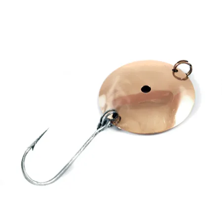 Kuparinsävyt hallitsevat tätä Canadian Baitin pyöreää kiekkouistinta, jonka tuotekoodi on 2959. Tämä Yhdysvalloissa valmistettu yksilö painaa 21 g (3/4 oz) ja sen halkaisija on 5 cm (2"). Se on valmistettu vuosien 1960 ja 1970 välillä. Kääntöpuolella on Canadian Bait Mfg Co:n selkeä leima sekä "PAT. APPLD. FOR" -merkintä, mikä korostaa sen varhaista kehityshistoriaa. Rakenteeseen kuuluu keskireikä ja vankka yksittäiskoukku, joka on kiinnitetty uistinrenkaalla. Tämä kyseinen yksilö on säilynyt erinomaisessa 5/5-kunnossa, ja metallin alkuperäinen hohde on tallella. Heitto- ja uistelukäyttöön suunniteltu uistin käyttää yläosaan asennettua uistinrengasta pääasiallisena siiman kiinnityspisteenä.
