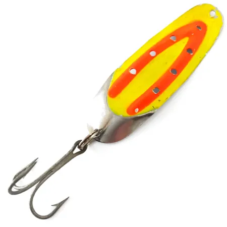 Nikkelipinnoite antaa peilimäisen viimeistelyn tämän 5513-mallin kääntöpuolelle, jossa on suunnittelija J. Rustowiczin tunnusomainen meistokuvio. Painoltaan 12,5 g (2/5 oz) oleva Charger №3 UV hyödyntää erittäin näkyvää fluoresoivaa keltaista ja punaista kuviota, jota korostaa yhdeksän erityistä UV-reaktiivista pistettä, jotka on suunniteltu loistamaan syvässä tai sameassa vedessä. Tämä USA:ssa valmistettu yksilö on 8 cm (3 1/4") pitkä ja edustaa nykyään Lake Productsin valmistaman tuotemerkin kehitystä. Kunto on vankka 5/5, ja siinä on huomattavan puhdas pinta ja eloisa maali, joka näyttää juuri valmistuneelta. Sen rakenne perustuu perinteiseen lusikkauistimeen, johon on yhdistetty tukeva kolmihaarakoukku vahvalla uistinrenkaalla luotettavaa heitto- tai uistelukalastusta varten. Fluoresoiva viimeistely on integroitu suoraan pintasähköön, mikä varmistaa UV-ominaisuuksien tehokkuuden eri valaistusolosuhteissa.