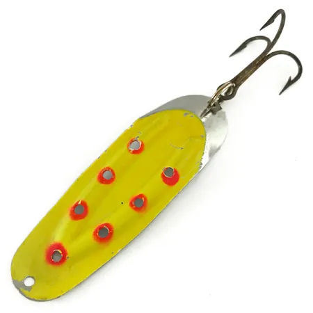 Seitsemän kirkkaanpunaista pistettä on sijoitettu huolellisesti tämän 8 cm:n lusikkauistimen kohokuvioituihin uriin, mikä luo voimakkaan kontrastin kirkkaankeltaista viimeistelyä vasten. Painoltaan 12,5 g painavassa Charger №3 UV -mallissa on fluoresoiva pinnoite, joka hohtaa ultraviolettivalossa, auttaen säilyttämään näkyvyyden syvemmässä tai sameassa vedessä. Nikkelirunko jää näkyviin siiman kiinnityspäässä, jossa keltainen maali kapenee, tarjoten metallista välkettä. Kääntöpuolella J. Rustowiczin nimi on selvästi meistetty kiillotettuun metalliin, mikä osoittaa nykyään Lake Productsin valmistaman mallin alkuperän. Tämä nimenomainen yksilö, tuotekoodiltaan 7432, on varustettu suurella kolmihaarakoukulla, joka soveltuu eri petokalojen heittokalastukseen tai uisteluun. Pitkänomainen profiili ja meistetyt urat ovat tämän amerikkalaisen klassikon tunnusmerkkejä. Tämän vieheen kunto on erinomainen, arvosanalla 5/5.