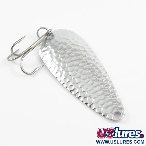 Vasaroitu nikkelipinnoite määrittää tämän Worth Chippewa -lusikan pinnan, ja tekstuuri on suunniteltu erityisesti heijastamaan valoa laajalle vesipatsaassa. Pituudeltaan 7 cm (2 3/4") ja painoltaan 14 g (1/2 oz) oleva klassinen amerikkalaisvalmisteinen lusikkauistin edustaa edullisia tarvikkeita, jotka saavuttivat valtavan suosion yhdysvaltalaisten kalastajien keskuudessa vuosisadan puolivälissä. Kääntöpuolella on sileä, kiillotettu viimeistely, johon on leimattu "S" lähelle siiman kiinnityspistettä, sekä vintage-tyylinen oranssi "Dunn's"-jälleenmyyntitarra. Metalli on poikkeuksellisen puhdas ilman kulumisen merkkejä, mikä vastaa kuntoluokitusta 5/5. Alkuperäinen kolmihaarakoukku on kiinnitetty tukevalla uistinrenkaalla ja se on terävä ja valmis heittokalastukseen tai vetouisteluun. Tämä yksilö, tuotekoodiltaan 2868, on erinomainen esimerkki Worthin käytännönläheisestä valmistustyylistä, joka hallitsi kotimarkkinoita 1900-luvun jälkipuoliskolla.