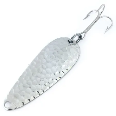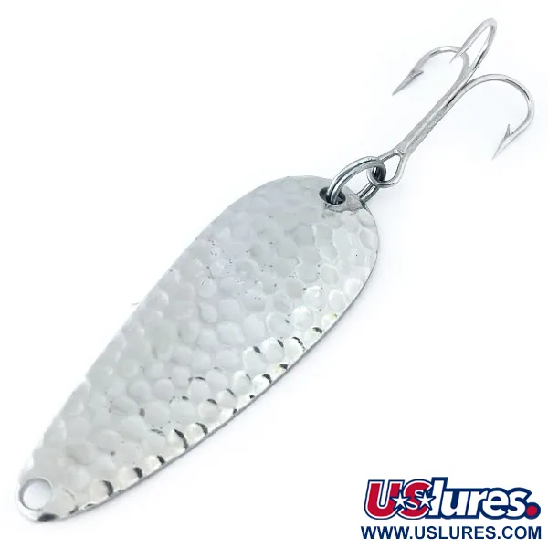 Vasaroitu nikkelipinnoite luo erittäin heijastavan pinnan tähän 10 g (1/3 oz) Chippewa Steel Spoon -lusikkaan. Pinnan tekstuuri on suunniteltu erityisesti heijastamaan valoa useista eri kulmista. Tämä 5,5 cm (2 1/4") pitkä Worth-uistin on klassinen esimerkki vuosisadan puolivälin amerikkalaisesta metallityöstä, joka hallitsi pakkipakkeja koko 1900-luvun loppupuolen. Etupuolta leimaa kuoppainen kuviointi, kun taas kääntöpuoli on sileä ja siihen on stanssattu tuotemerkin nimi sekä valmistusmaa USA. Tämä yksilö, tuotekoodiltaan 10965, on säilyttänyt kirkkaan ja puhtaan ulkonäkönsä, mikä vastaa sen 5/5-kuntosuositusta. Uistin on varustettu yhdellä suurella kolmihaaralla, joka on kiinnitetty takapäähän vankalla uistinrenkaalla. Näitä lusikoita käytettiin heitto- ja uistelukalastuksessa hauelle, ahvenelle tai suuremmille taimenille eri vesiolosuhteissa.