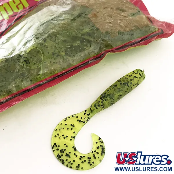 Chartreuse Pepper on näiden 7 cm (2 3/4") sirppipyrstöisten jiggien pääväri, ja niissä on tiheästi mustia pepper-hiutaleita visuaalisen tekstuurin luomiseksi. Nämä Table Rock Bait & Tackle Co.:n USA:ssa valmistamat vieheet toimitetaan alkuperäisessä vaaleanpunaisessa minigrip-pussissa, jossa on "Lures for Lunkers" -slogan. Pakkaus, tuotekoodi 6681, sisältää 15 yksilöä. Pehmeä muoviseos on säilyttänyt alkuperäisen joustavuutensa ja suolakyllästetyn tuntumansa. Vieheet ovat alkuperäisessä tehdaskunnossa ja käyttämättömiä. Pussissa on jonkin verran rypistymistä ja pientä pintakulumaa, mikä on tyypillistä vanhemmalle varastolle, mutta syötit ovat säilyneet suojassa luonnonvoimilta.