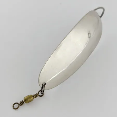 Tämä tasan 8,5 cm (3 1/4") pituinen hopeanhohtoinen Clark Specialty Corp Hammondsport NY -lusikkauistin edustaa 1800-luvun lopun amerikkalaisen metallityön pelkistettyä eleganssia. Valmistaja on valmistanut vastaavia vieheitä 1890-luvulta lähtien, ja tässä yksilössä perinne jatkuu tukevalla 17 gramman (3/5 oz) painolla. Kapeampaan päähän on kiinnitetty uistinrenkaalla vintage-henkinen messinkinen tynnyrileikari, kun taas leveämmässä, pyöristetyssä päässä on kiinteä lankalenkki. Tuotekoodilla 24019 luetteloitu kiillotettu pinta on säilynyt kirkkaana ilman merkittävää kulumista, mikä oikeuttaa kuntoluokitukseen 5/5. Etupuolen alkuperäinen lankalenkki on pysynyt täydellisen keskitettynä ja tukevasti kiinni metallirungossa.