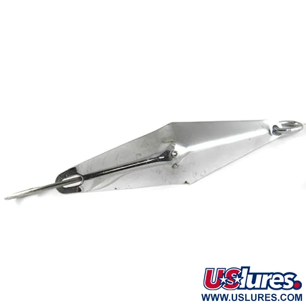 Tällä huomattavalla 3 1/2" (9 cm) pituisella ruohosuojatulla lusikalla on erottuva pitkänomainen timanttiprofiili, joka on tarkoitettu kalastukseen tiheässä kasvustossa. Pitkäaikainen amerikkalainen valmistaja James E. Clark valmisti tämän yksilön tuotekoodilla 1051. 1/2 oz (15 g) paino jakautuu tasaisesti kirkkaalle nikkelipinnalle, joka on säilyttänyt erinomaisesti alkuperäisen kiiltonsa. Koukutuksena on runkoon integroitu kiinteä yksittäiskoukku, jota suojaa suoraan metalliin niitattu ohut lankaruohosuoja. Pinnassa on vain lieviä iän merkkejä ja vähäisen käsittelyn jälkiä, mikä pitää kunnon vankkana 4/5. Kärjessä on tukeva kiinnitysrengas, joka on kiinnitetty siististi metallilevyn läpi stansattuun reikään.