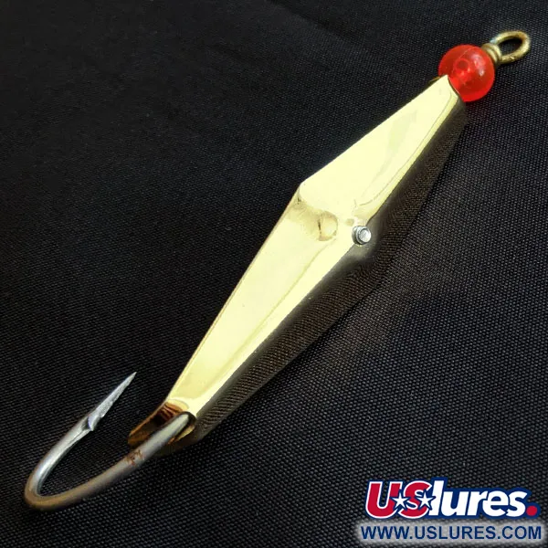 Vieheen sisäpintaan on selkeästi leimattu 'THE GENUINE CLARK SQUID ST. PETE., FLA.', mikä vahvistaa sen olevan aito James E. Clarkin valmistama uistin Floridan rannikolta. Painoltaan 1/4oz (8g) vieheessä on terävä, vinoneliön muotoinen profiili ja kiillotettu kultaus, joka heijastaa valoa tehokkaasti useista eri pinnoista. Siimalenkin lähellä oleva punainen helmi toimii hienovaraisena iskupisteenä metallirunkoa vasten. Ruohosuojattu rakenne perustuu yhteen vahvaan koukkuun, joka on kiinnitetty keskiruuvilla – tämä on valmistajalle tyypillinen toiminnallinen ratkaisu rannikkokalastukseen. Tämä yksilö, tuotekoodiltaan 18817, on 5/5 kunnossa; sen pinta on kirkas ja heijastava, ja osat ovat puhtaat. Koukku on integroitu lusikan runkoon koveralla puolella olevan pienen kiinnitysosan avulla.