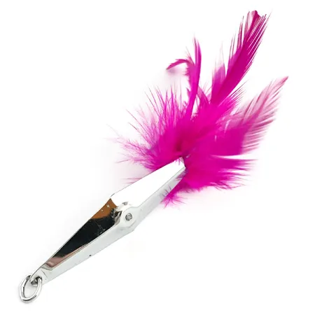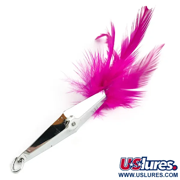 Tämän James E. Clarkin luomuksen 5 gramman (3/16 oz) runkoa koristaa näyttävä nippu kirkkaan pinkkejä höyheniä. Tämä 4,5 cm (1 3/4") pitkä Clark Spoon (tuotekoodi 5856) on viimeistelty kiillotetulla kromilla, mikä on tyypillistä korkealaatuisille yhdysvaltalaisille lusikkauistimille. Ruohosuojattu rakenne perustuu höyhenten sekaan upotettuun yksihaarakoukkuun, joka mahdollistaa kalastamisen kasvuston seassa ilman tarttumista. Heijastava metallipinta ja osat ovat hyvässä kunnossa, ja niissä on vain vähäisiä käytön jälkiä (kuntoarvio 4/5). Etulenkiin on tehtaalla asennettu uistinrengas suoraa siiman kiinnitystä varten.