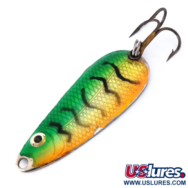 Eloisaan Rainbow Perch -väriin kastettu 9 g (1/3 oz) painoinen metallinen lusikkauistin heijastaa klassisia amerikkalaisia perinteitä. Sen 5,5 cm (2 1/4") profiilissa on kohokuvioitu suomukuvio, joka välkehtii vihreiden ja oranssien sävyjen alla. Nokan lähellä oleva maalattu kultamusta silmä toimii luonnollisena iskupisteenä petokaloille. Tuotekoodilla 10468 tunnistettavan Wahoo Class Tackle -lusikan kääntöpuoli on paljasta metallia, jossa on vähäisiä iän tuomia jälkiä, ansaiten kuntoluokituksen 4/5. Järeät varusteet, kuten vahva uistinrengas ja kolmihaarakoukku, tekevät tästä Yhdysvalloissa valmistetusta vieheestä valmiin heittokalastukseen kasvuston reunaan tai vetouisteluun syvänteissä.