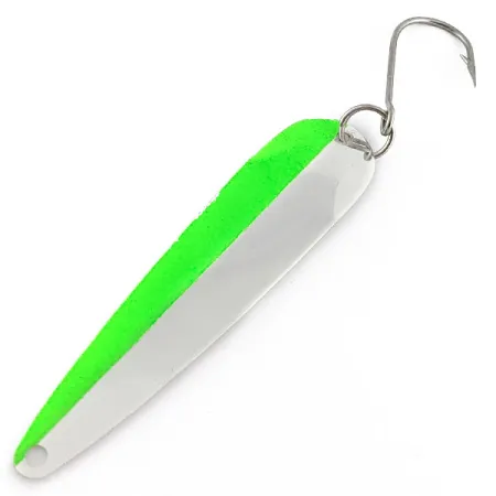 Tämä 4,5 gramman (3/16 oz) painoinen ja kapeaprofiilinen yhdysvaltalainen lusikkauistin on suunniteltu kirkkaisiin vesiin, joissa tarvitaan tarkasti kohdistettua välkettä. Kiillotetun nikkelirungon ulkoreunassa kulkee kirkas neonvihreä raita, joka luo voimakkaan kontrastin heijastavaa metallipintaa vasten. Tämän Clear Water 101 -mallin (tuotekoodi 23201) pituus on 8 cm (3 1/4"), ja siinä on perinteisille heitto- ja uistelulusikoille tyypillinen kapeneva muoto. Uistimen perässä on järeällä uistinrenkaalla varustettu vahva yksittäiskoukku – kokoonpano, jota taimenen ja lohen kalastajat suosivat sen varman tartutuksen ja vähäisemmän tarttumisriskin vuoksi. Kääntöpuolelle tuotemerkki on meistetty suoraan puhtaaseen nikkelipintaan. Tämä yksilö on moitteettomassa 5/5-kunnossa, eikä maalatuilla tai pinnoitetuilla pinnoilla ole merkkejä käytöstä. Nokan kiinnitysreikä on siisti ja valmis kalastukseen.