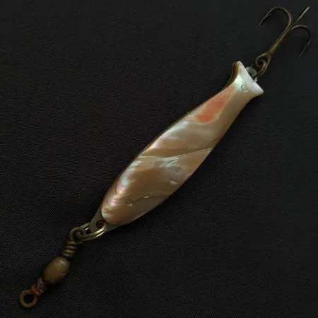 Tämä 7 cm (2 3/4") pituinen Compac-lusikkauistin on hieno esimerkki 1900-luvun puolivälin japanilaisesta uistinvalmistuksesta, jossa on hyödynnetty aitoa, sateenkaariväreissä hohtavaa helmiäistä. Luonnonkuori on muotoiltu tarkasti uistimen kalamaiseen profiiliin ja kiinnitetty hopeanväriseen metallirunkoon kahdella näkyvällä niitillä. Malli 19657 painaa 14 g (1/2 oz), mikä antaa sille riittävästi painoa heittokalastukseen tai syvällä tapahtuvaan vetouisteluun. Kiillotettu ja sileä metallinen kääntöpuoli luo tyylikkään kontrastin helmiäisupotuksen orgaaniselle hohdolle. Uistin on varustettu kestävällä tynnyrileikarilla nokassa ja pronssinvärisellä kolmihaarakoukulla perässä. Tämä yksilö on erinomaisessa kunnossa, ja sen kuntoluokitus on 5/5. Japanilainen alkuperä muistuttaa ajasta, jolloin Compac tunnettiin persoonallisten lusikkauistimien maahantuojana, joissa yhdistyivät näyttävä ulkoasu ja kestävyys.