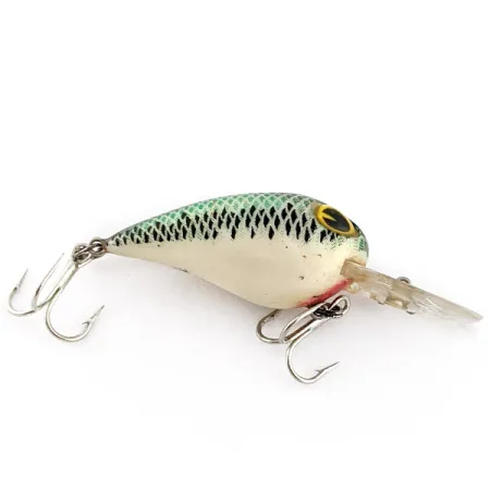 Selän suomukuviointi paljastaa klassisen vihreä-mustan bass-värityksen tässä 5 cm:n (2") mittaisessa vieheessä. Cotton Cordell on painottanut tämän Wiggle O -mallin 7 gramman (1/4oz) painoiseksi, mikä on vakio tarkkuusheittoihin ahtaissa rakenteissa. Kirkkaaseen uintilevyyn on stanssattu "Wiggle O" -nimi, mikä varmistaa mallin tunnistettavuuden. Suuret keltaiset silmät syvän mustilla pupilleilla hallitsevat etuprofiilia, ja ne sijaitsevat aivan punertavan kurkkuosan yläpuolella, mikä tuo kontrastia kermanvaaleaan vatsaan. Tuotekoodilla 23246 varustetussa vieheessä on alkuperäiset koukutukset, sisältäen kaksi kolmihaarakoukkua. Kuntoarvio on 5/5, ja vieheen pinta on säilynyt erinomaisesti korostaen tarkkaa suomukuviointia. Valettu muovi ja yksityiskohtaiset maalauskuviot määrittävät tätä bass-kalastajille suunnattua valmistuskautta.